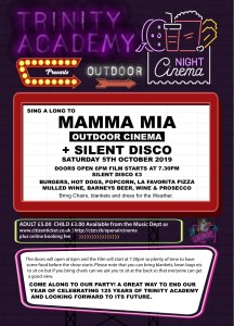 Trinity Academy Movie Night- Saturday 5th October 2019 On 27 September, 201928 October, 2019 By Lesley-Anne WeirIn News and events To book tickets please click on the link below and follow the instructions. Trinity Academy Movie Night 2019 Like us / tweetTweetLike Loading...